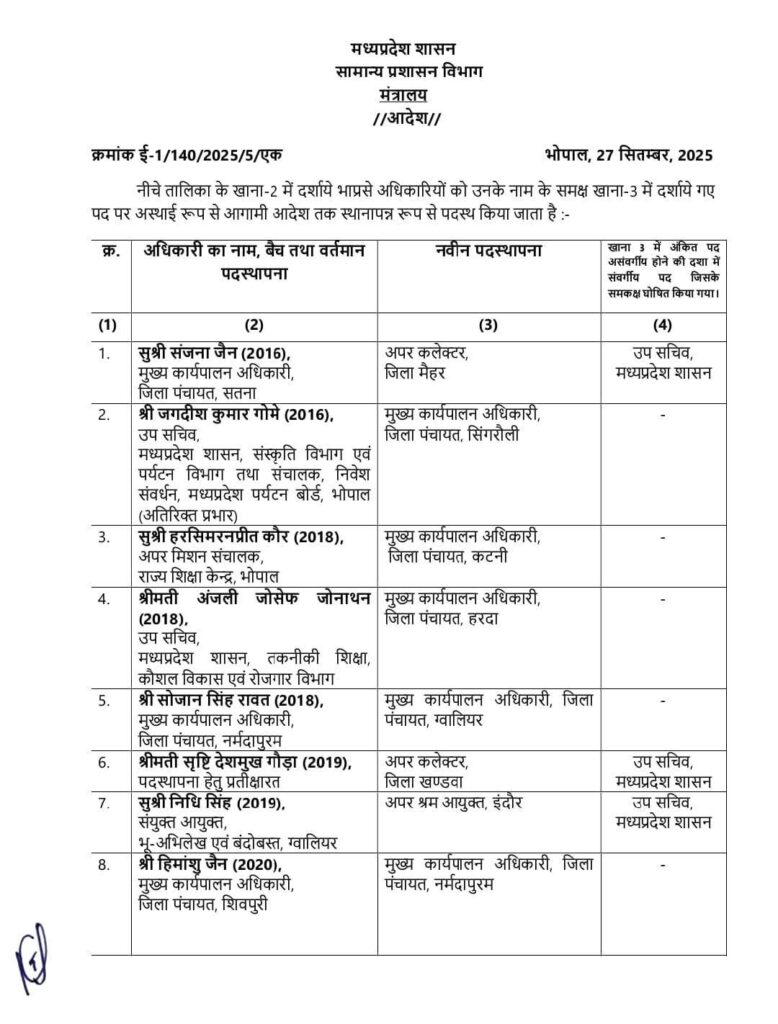 सामान्य प्रशासन विभाग द्वारा भारतीय प्रशासनिक सेवा के अधिकारियों की नवीन पदस्थापना के आदेश जारी।