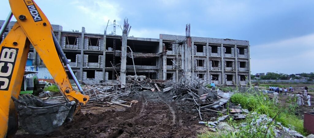 सूत्रों से मिली जानकारी के अनुसार यह विद्यालय भवन 28 करोड़ रुपये की लागत से एनएनवी कंस्ट्रक्शन कंपनी, भोपाल द्वारा निर्मित किया जा रहा है। हादसा उस समय हुआ जब लगभग 1.25 लाख वर्गफीट क्षेत्र में छत ढलाई का कार्य चल रहा था। आरोप है कि निर्माण एजेंसी द्वारा ढलाई से पहले सेंटिंग (लोहे की सपोर्टिंग संरचना) को सही तरीके से स्थापित नहीं किया गया था। ढलाई के दौरान ही यह सपोर्टिंग संरचना दबाव नहीं झेल पाई और अव्यवस्थित होकर गिर गई। इसी वजह से भारी-भरकम छत का हिस्सा धड़ाम से नीचे आ गिरा और मजदूर उसके नीचे दब गए।