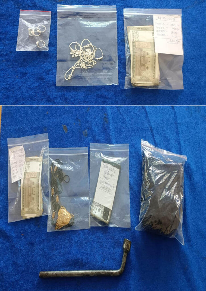 पुलिस ने आरोपित के कब्जे से अपराध क्रमांक 20/2026 में चांदी की 2 जोड़ी पायल, चांदी की 2 जोड़ी बिछिया, नकद 5,500 रुपये एवं अपराध क्रमांक 27/2026 में एंड्रॉयड मोबाइल फोन, ऊनी गरम टोपा,घटना में प्रयुक्त लोहे की रॉड (लिवर), बेंटेक्स का पीले रंग का हार’ नकद 4,000 रुपये जब्त किये है।