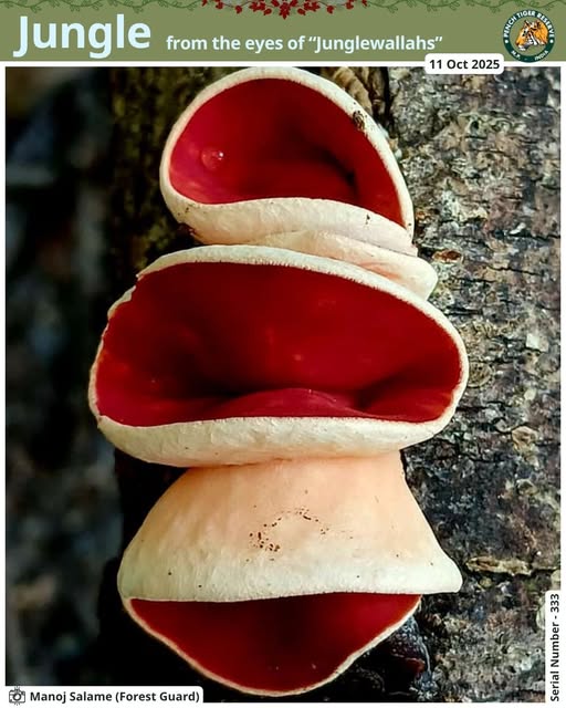 सिवनी, 11 अक्टूबर। मध्य प्रदेश के सिवनी जिले के विश्वविख्यात पेंच राष्ट्रीय उद्यान में यह सुंदर कवक फिलिप्सिया डोमिनजेंसिस (Phillipsia domingensis) जिसे आमतौर पर मॉव एल्फ कप (Mauve Elf Cup) या स्कारलेट कप (Scarlet Cup) कहा जाता है, वाकई जंगल की धरती पर खिली एक अद्भुत कलाकृति है। जिसे फॉरेस्ट गार्ड मनोज सलामें ने शनिवार को अपने कैमरे में कैद किया।